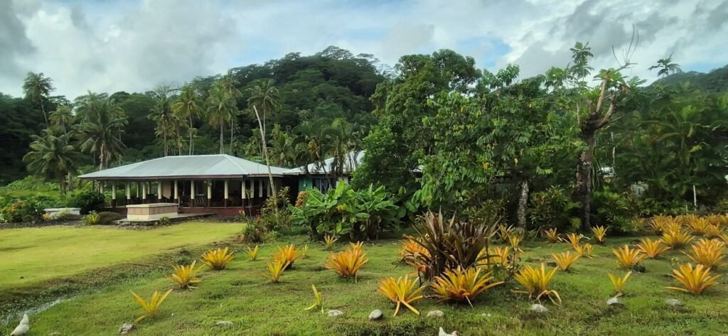 Saliendo de la ciudad nos dirigimos hacia el este por la Ring Road que bordea la costa con paisajes maravillosos. Pasamos por numerosos pueblos en los que también vimos tumbas en el jardín y zonas con fales para la reunión de la familia ‘aiga’, así como colegios desde donde los niños nos saludaban . Comprobamos que estos jardines siempre están limpios y ordenados. La vegetación que nos rodea es abrumadora, con árboles, flores y grandes helechos. .