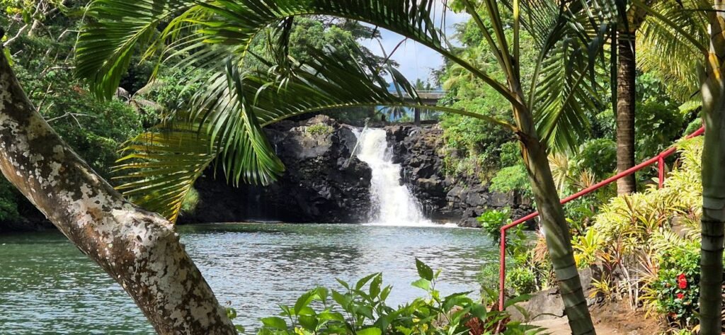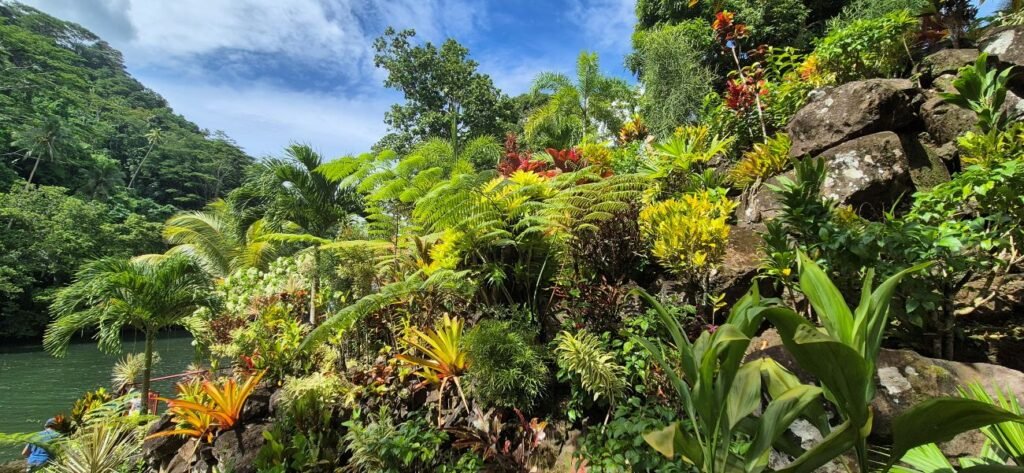 Nuestra primera parada fue en la cascada de Falefa. La zona cuenta con un precioso jardín con plantas y flores y que se extiende a lo largo de un sendero que desciende hacia una plataforma.