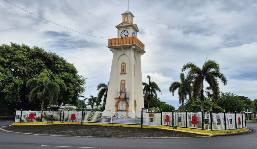 Tras salir paseamos por la ciudad pasando frente al Apia Clock Tower que es un monumento conmemorativo de guerra además de torre de reloj. Honra a los samoanos que sirvieron en la Primera Guerra Mundial siendo uno de los símbolos más reconocibles de Apia.