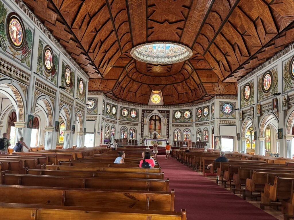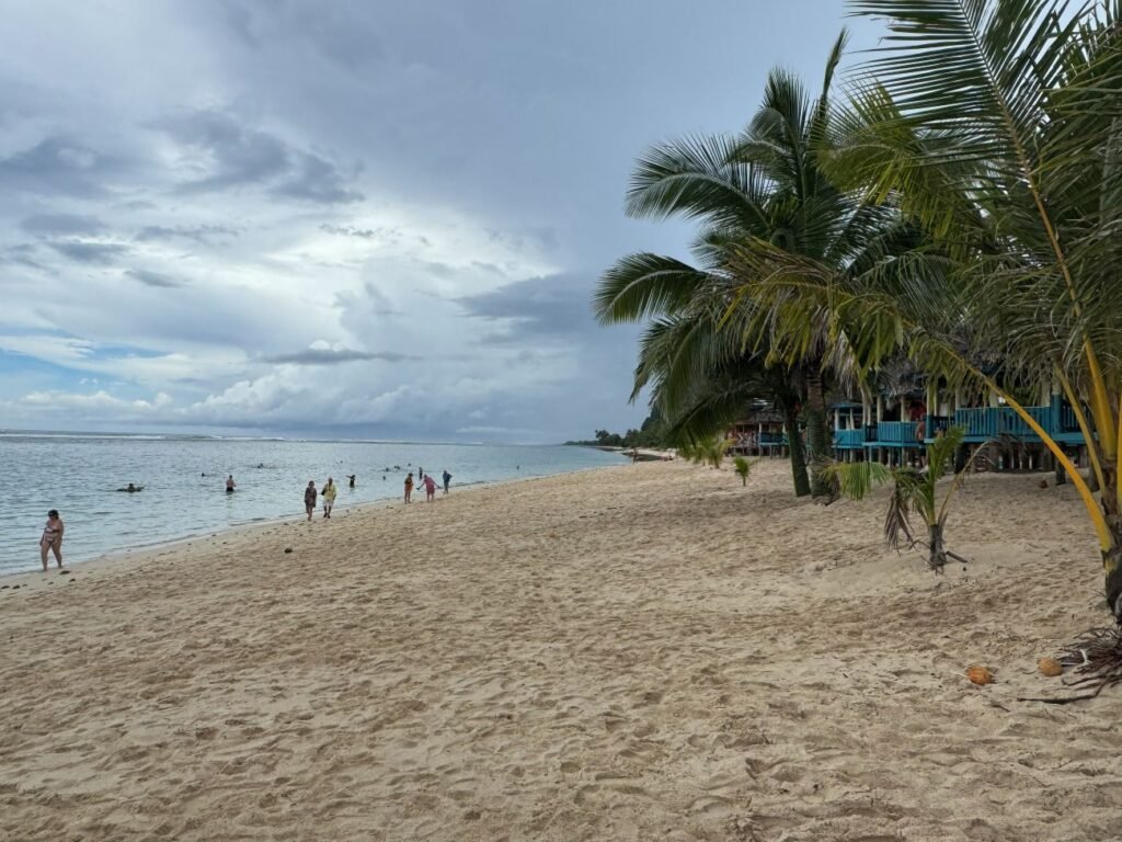 Una vez instalados nos fuimos al agua, que estaba templada y muy limpia, aunque no tenía el color azul tan típico, ya que estaba muy nublado y en algún momento hasta cayeron unas gotitas. Nos pasamos un buen rato en el agua y finalmente salimos para comer las pocas cosas que habíamos conseguido. Dos horas y media más tarde tomamos el autobús que nos devolvía al barco en un trayecto que duró una hora y veinte minutos. Al llegar al puerto subimos a nuestro camarote para dejar las bolsas y volvimos a bajar para ir en un taxi compartido hacia el centro ciudad, donde paramos frente la preciosa catedral de la Inmaculada Concepción que es la principal Iglesia Católica en Samoa