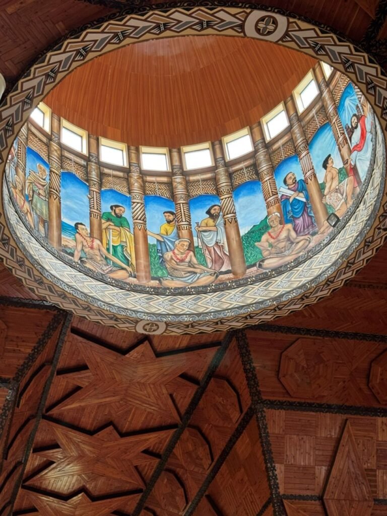 El edificio original fue dañado por desastres naturales y posteriormente reconstruido y renovado, reabriendo en 2014 con un diseño moderno y una arquitectura que mezcla estilo europeo y elementos samoanos, un interior amplio con techos altos, coloridas pinturas y vitrales con escenas bíblicas adaptadas al contexto del Pacífico y un techo de madera espectacular.