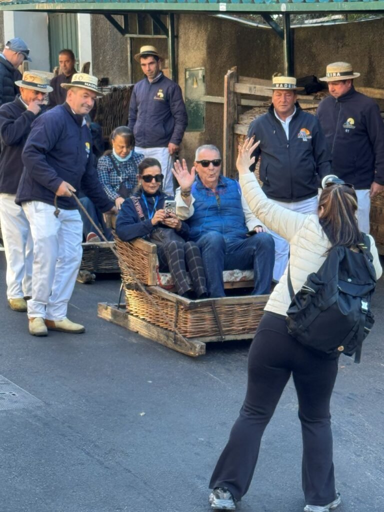 Tras la visita de la iglesia realizamos una actividad divertida que era el descenso con los famosos toboganes, conocidos como Carros de Cesto do Monte, son una de las tradiciones más famosas y singulares de Funchal. Son trineos de mimbre montados sobre patines de madera, hechos de forma artesanal. Comienzan en Monte, cerca de la Iglesia de Nossa Senhora do Monte, y descienden hasta Livramento, en las afueras de Funchal. El trayecto dura unos 10 minutos y cubre aproximadamente 2 kilómetros cuesta abajo, guiados por dos hombres llamados carreiros, vestidos con ropa tradicional blanca y sombrero de paja. Estos trineos surgieron a mediados del siglo XIX como un medio de transporte rápido para bajar desde Monte hasta el centro de la ciudad.