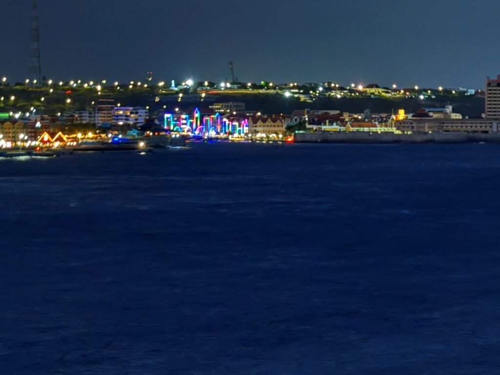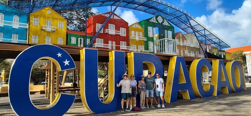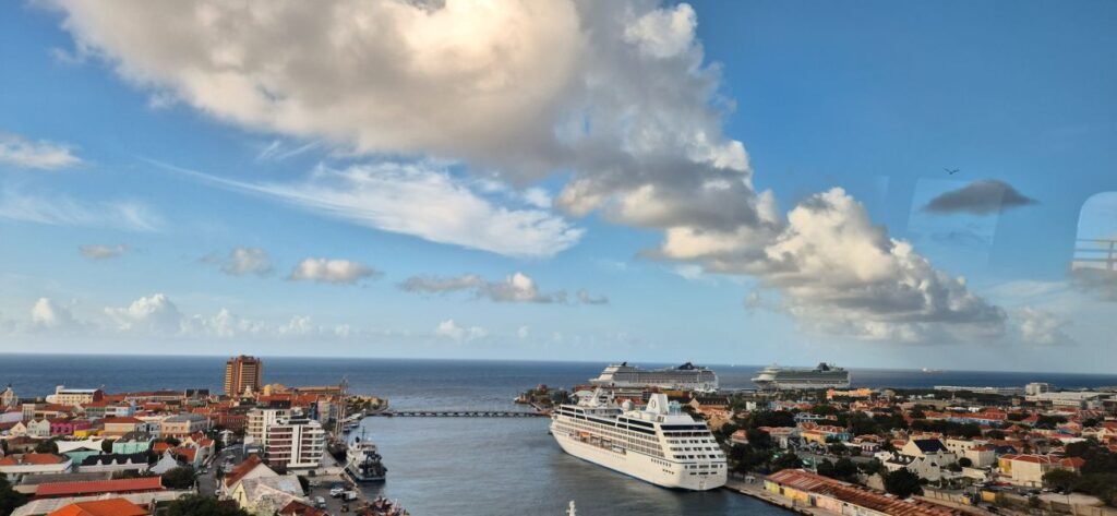 Tras un día de navegación frente a las costas venezolanas llegamos a nuestra próxima escala, el puerto de Willemstad capital de la antigua colonia holandesa de Curaçao. Formaba parte de las Antillas Holandesas conocidas como ‘A, B, C’ es decir Aruba, Bonaire y Curaçao. Os explicamos un poco de su historia, que hasta la llegada de los españoles la isla estaba habitada por el pueblo indígena arawak, conocidos como los caquetíos, que vivían de la pesca, la agricultura y el comercio con otras islas del Caribe y la costa venezolana. Fue avistada por Alonso de Ojeda en 1499 y pasó a formar parte del Imperio español. Sin embargo, España no la valoró mucho y trasladó a muchos indígenas a otras colonias. En 1634, la Compañía Neerlandesa de las Indias Occidentales conquistó la isla y Curaçao se convirtió en un importante puerto comercial y centro del comercio atlántico, sobre todo por el tráfico de esclavos africanos, que trabajaban en los campos de caña de azúcar. La esclavitud fue abolida oficialmente en 1863, lo que transformó profundamente la sociedad y la economía local. A comienzos del siglo XX, la refinería de petróleo, que dio lugar a la actual compañía petrolífera Shell, ligada a Venezuela convirtió a Curaçao en un centro industrial clave del Caribe, atrayendo migración y crecimiento urbano a Willemstad, aunque la refinería está inactiva desde 2019. Actualmente su economía se basa sobre todo en el turismo. Fue parte de las Antillas Neerlandesas hasta su disolución en 2010. Es un país autónomo dentro del Reino de los Países Bajos, con gobierno propio, aunque comparte defensa y relaciones exteriores. La moneda es el florín antillano con un cambio de 1 euro por 2,10 florines. Hoy es conocida por su mezcla cultural afrocaribeña, europea y latinoamericana. Su arquitectura es colorida y tiene un idioma criollo propio, el papiamento, mezcla de portugués y español que son su base principal, así como el holandés y diversas lenguas africanas, aunque su idioma oficial es el holandés.Nos levantamos temprano y subimos a ver la maniobra de atraque del barco y las primeras imágenes de la ciudad. Tras desayunar quedamos a las 8.15 en recepción con Puri, Antonio y Julio, fuimos al muelle donde localizamos a la persona que va a ser nuestra guía en la excursión contratada a través de Viator. Se trata de Nelly. Vamos en un pequeño microbús solo para nosotros cinco. El muelle de cruceros se halla en el barrio de Otrobanda. Tras circular por él nos dirigimos a la otra parte de la ciudad a través del Puente Reina Juliana que cruza la bahía de Schottegat.