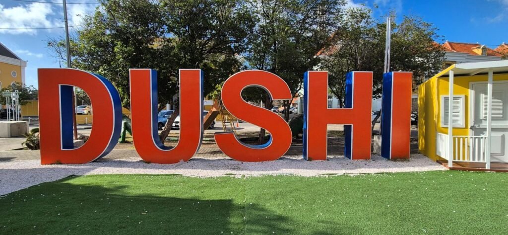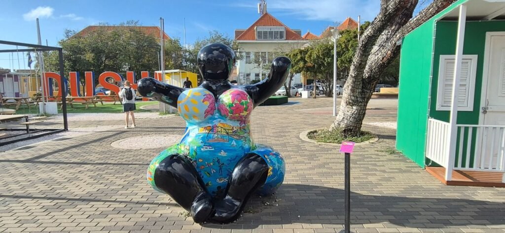 En el centro de la plaza hay diferentes elementos entre ellos una imagen de la palabra Dushi cuyo significado es cariño, estima etc. y es una palabra que se halla en todas las camisetas de recuerdo de la isla. También vemos un cartel de Curaçao y nos hacemos una foto de grupo, que es la foto de la portada de la página.