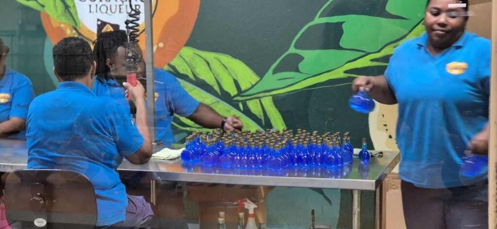 Regresamos al autobús y nos llevan a visitar la destilería de Chobolobo que era una antigua hacienda donde nos explicaron el proceso de elaboración del licor Curaçao que se produce a partir de los naranjos que trajeron de Valencia para plantar en la isla, pero que dieron un fruto muy amargo y fue abandonado. Siglos después fue vuelto a cultivar dando una fruta que los locales llaman laraha, y que es la base del licor local. El fundador de la destilería era un componente de la familia Senior, antiguos judíos conversos españoles que huyeron de la persecución por parte de la Inquisición, dirigiéndose primero a Amsterdam y más tarde a Curaçao. Uno de los descendientes al probar la piel de la laraha combinada con otras especies comprobó que producían un buen licor y fundó la compañía Senior & Cía. en 1896. Observamos el proceso de embotellado del licor y tomamos una degustación de dicho licor que tiene diferentes sabores, desde café, chocolate, tamarindo, etc.